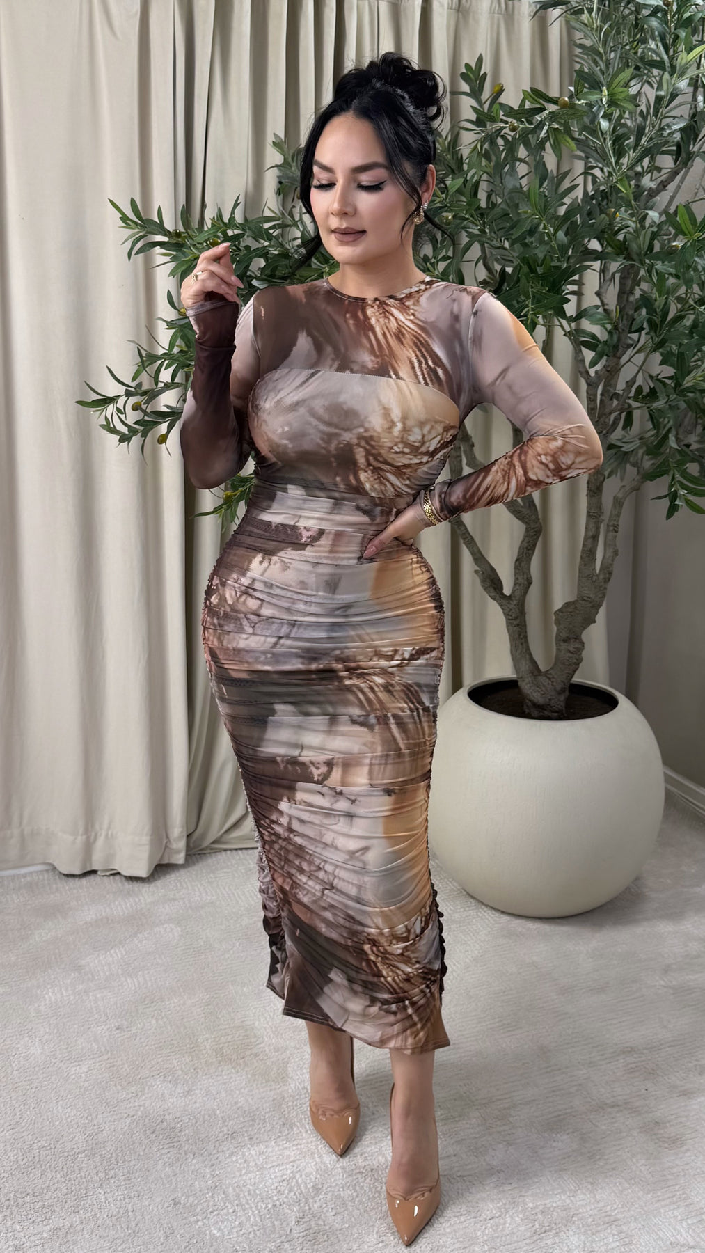 round neck long sleeve ruched marble printed midi dress