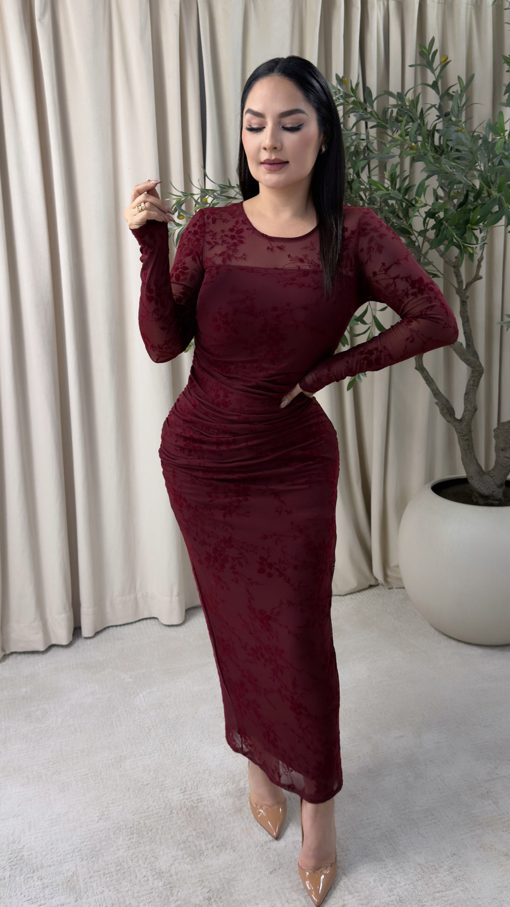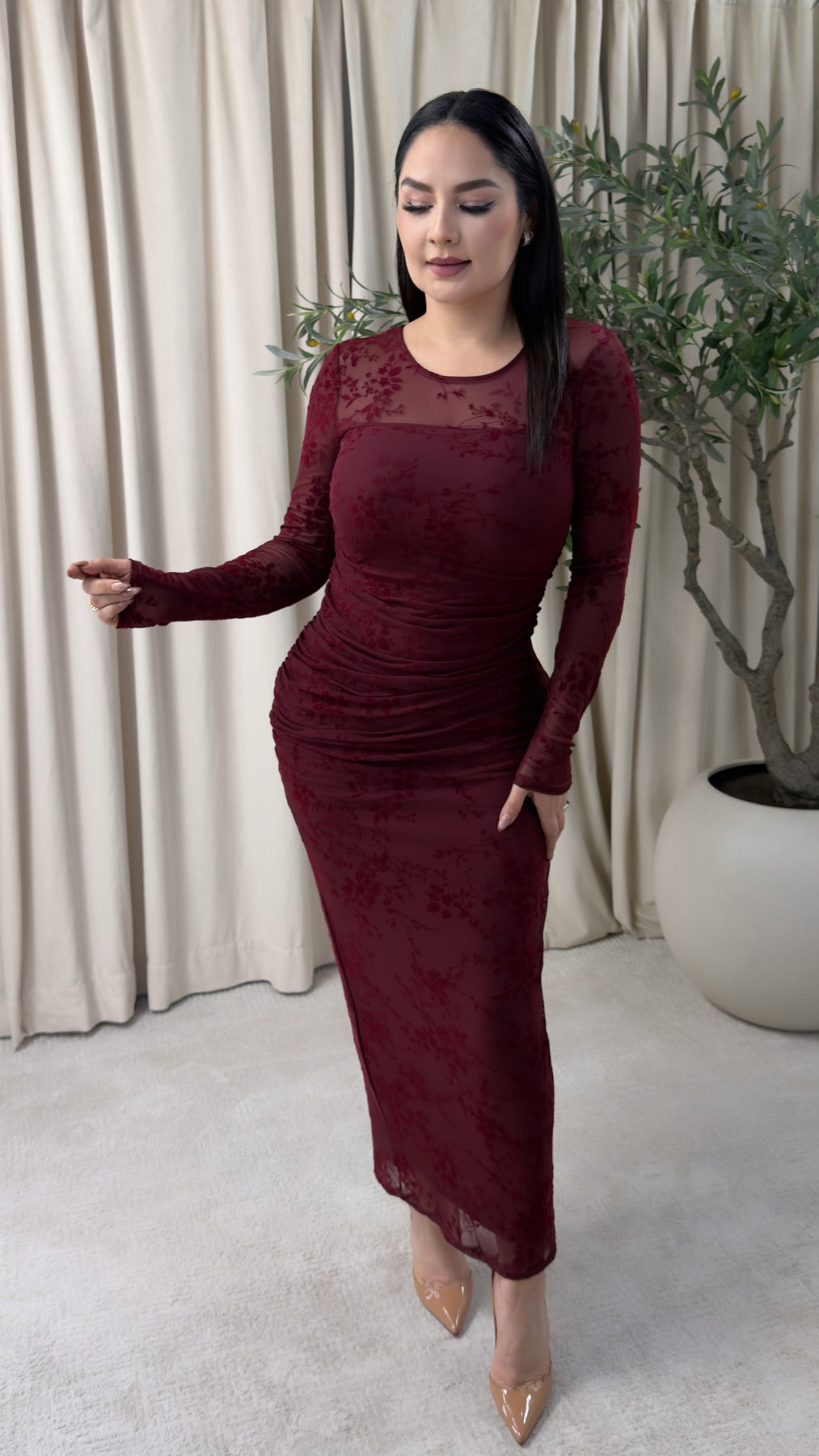 long sleeve flocked mesh ruched dress