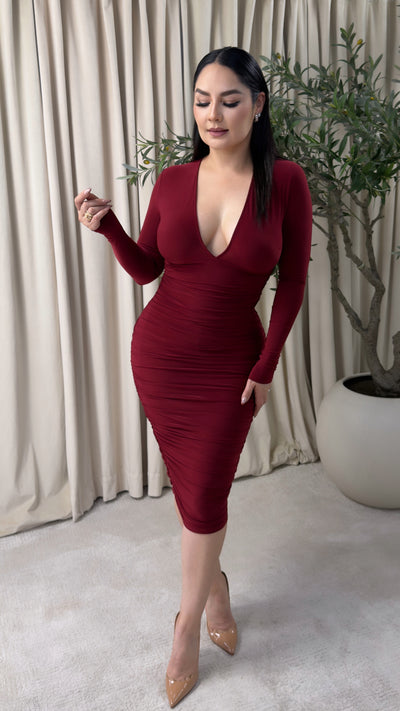 Deep V Cut. Long Sleeve. Fully Linen Midi Dress. Ruched Detail. Great Stretch.