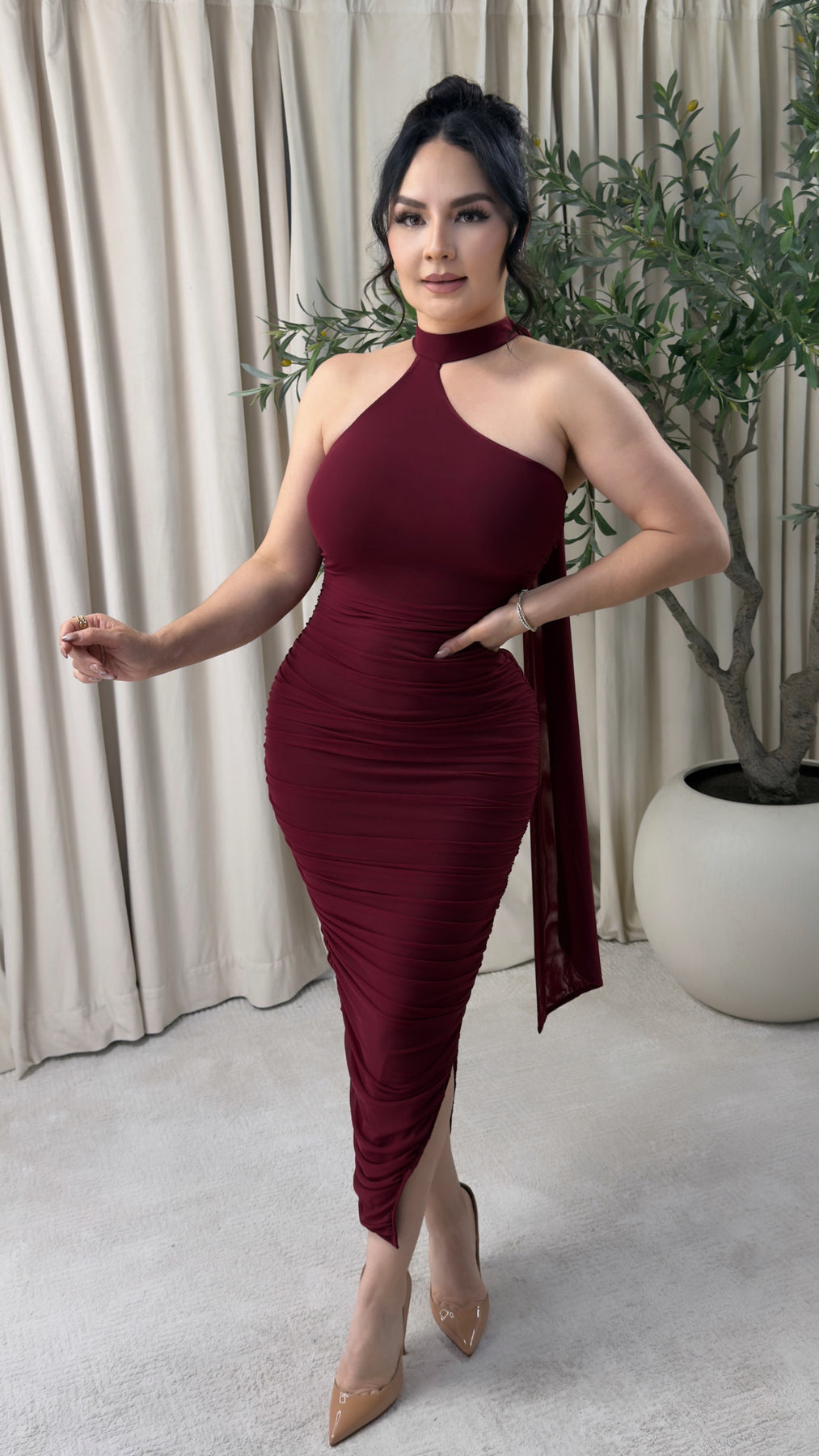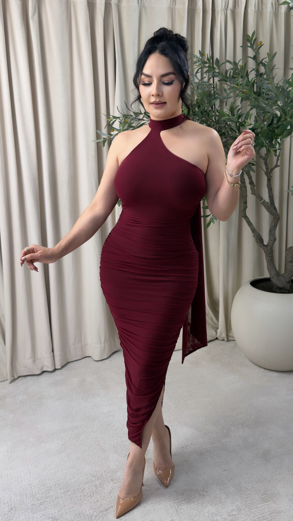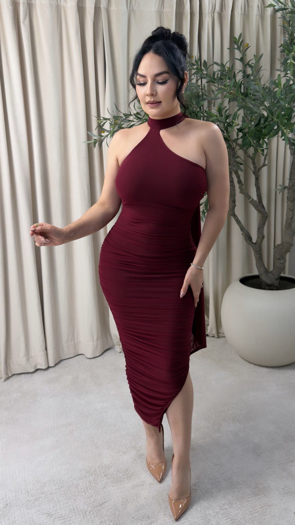 LUXE MESH ASYMMETRIC MOCK NECK WITH BACK DRAPED RUCHED BODYCON SLITTED MIDI DRESS
