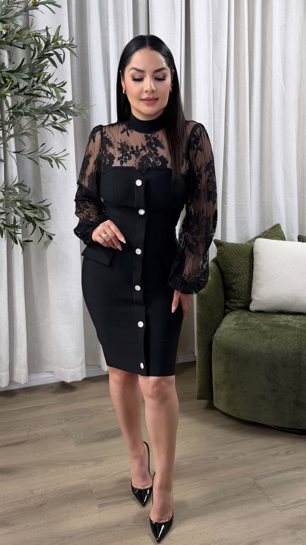 Button down column bandage dress & pocket detailing. Hidden zipper on back. ***ADORIA LACE TOP SHOWN ON PICTURE SOLD SEPARATELY***