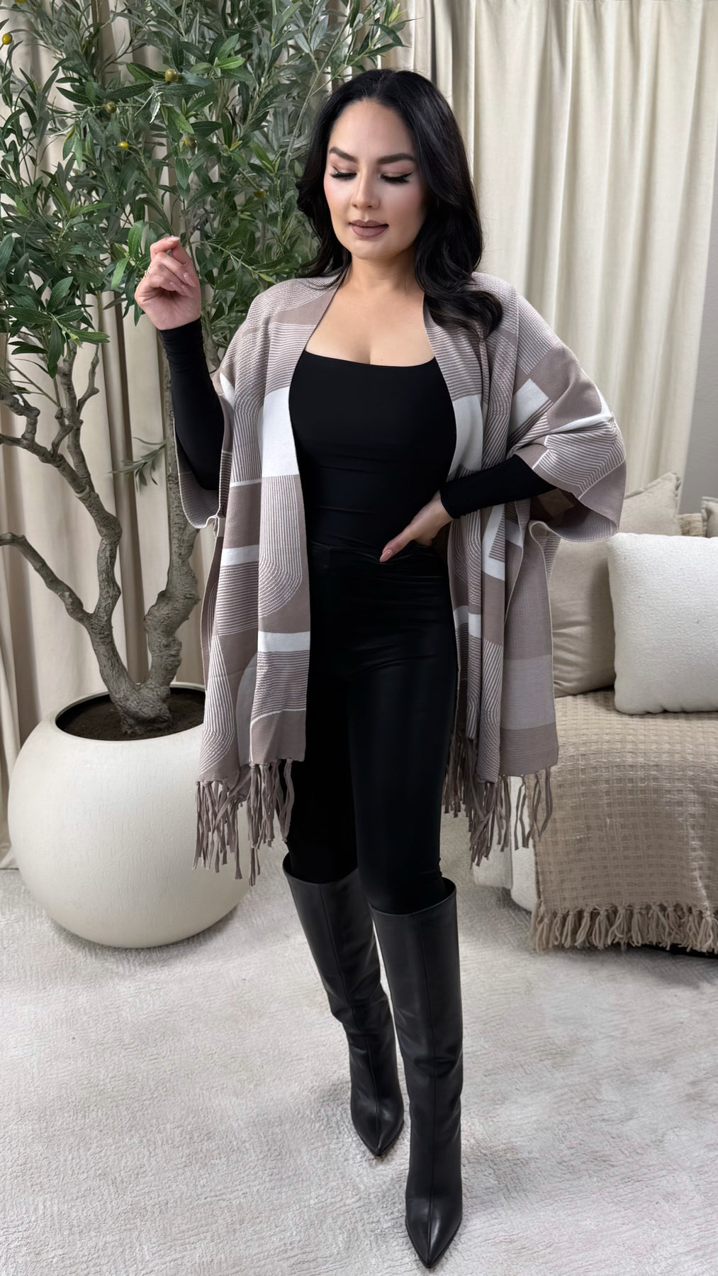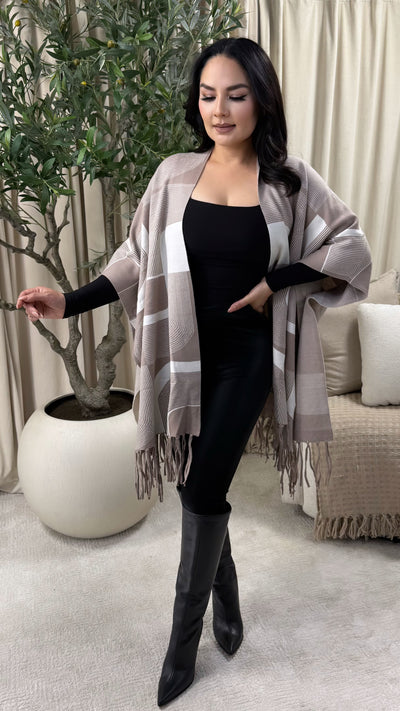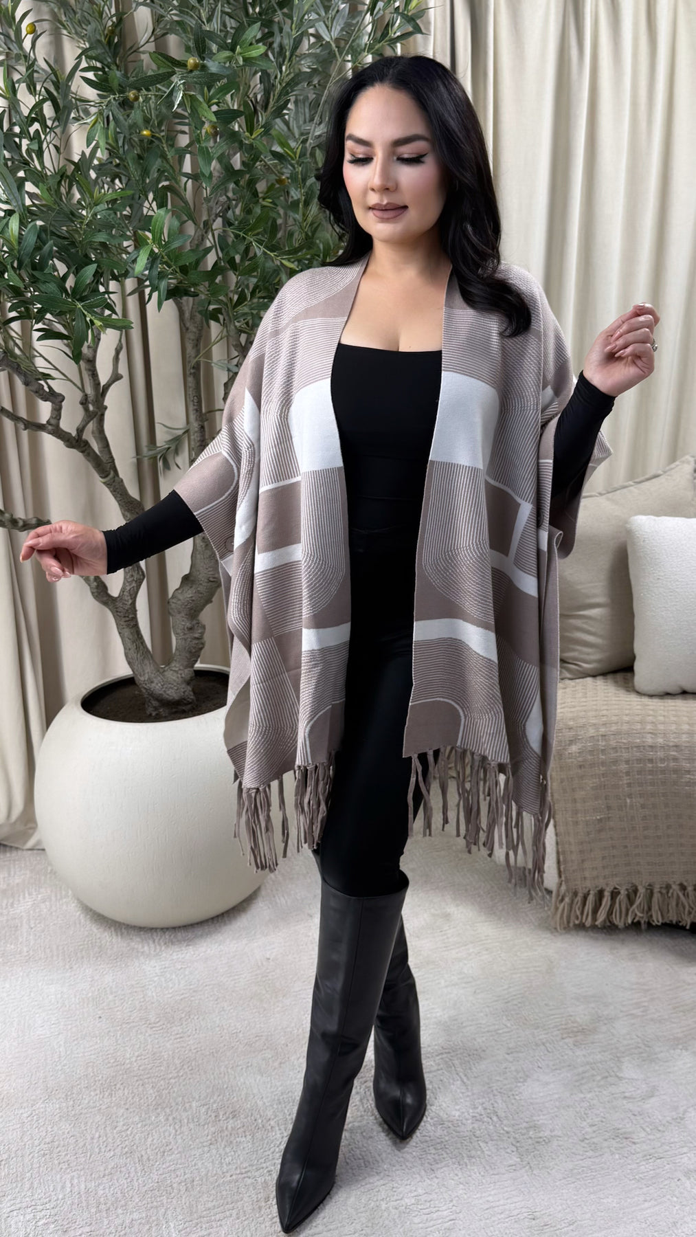 Top quality.  abstract print soft fringed detailed poncho. Model wearing Small