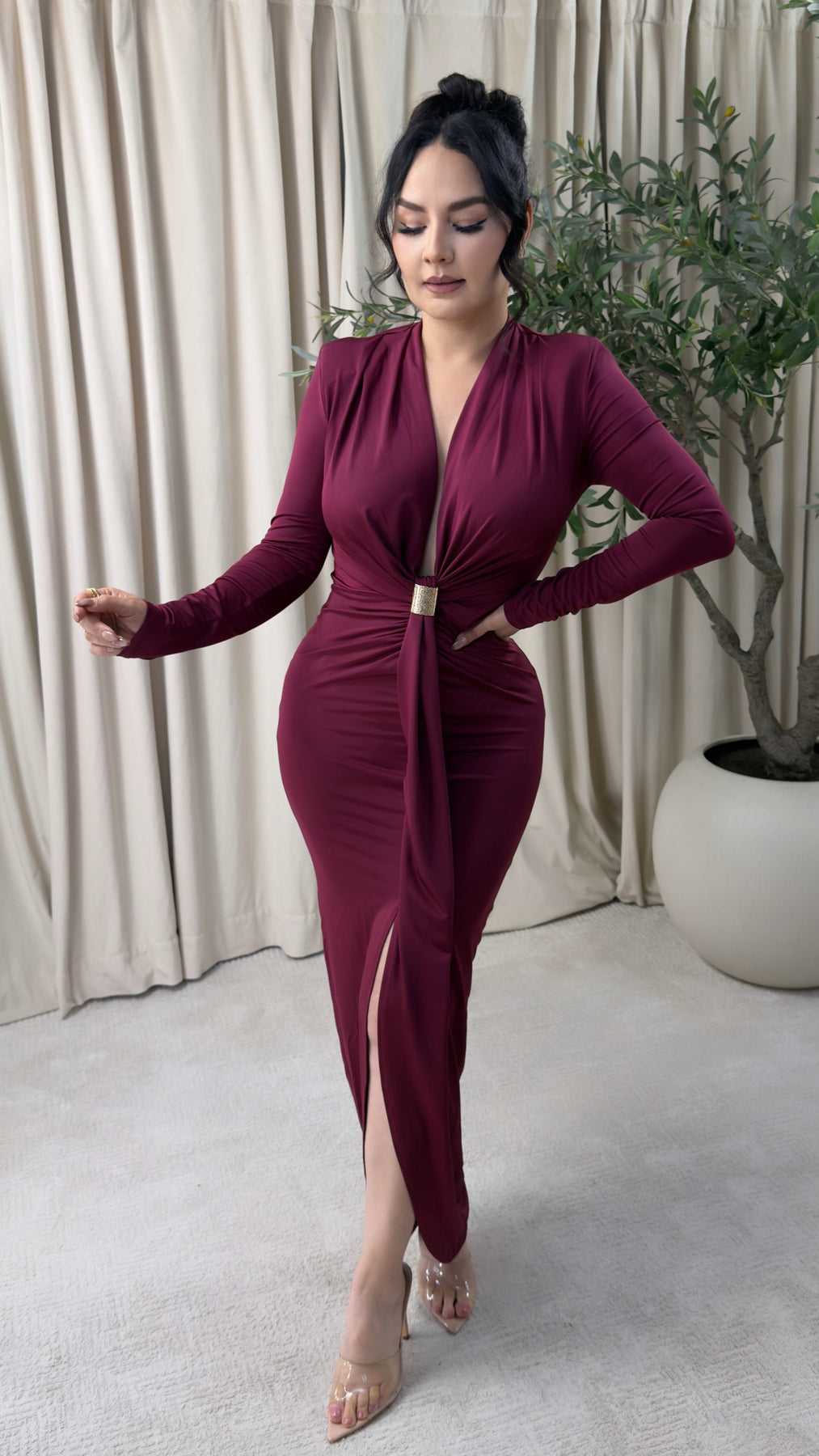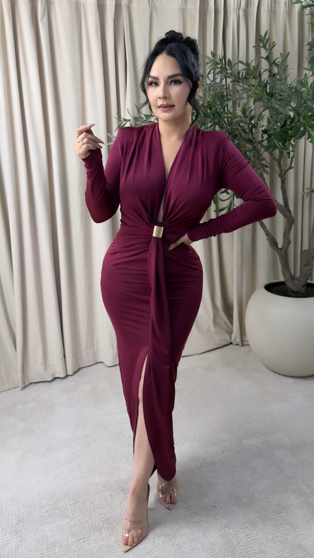 Deep V Cut. Long Sleeve. Fully Linen Midi Dress. Ruched Detail. Great Stretch.