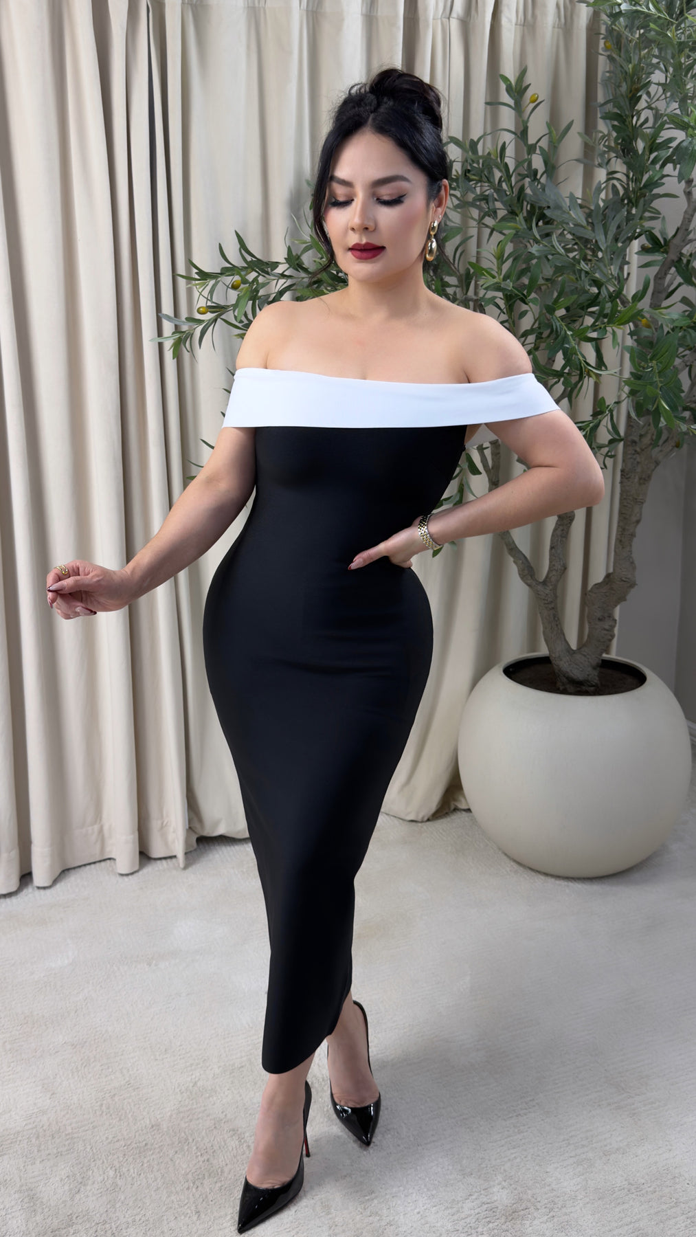 Contrast black and white off the shoulder bandage midi dress w/ zipper on back. Top quality. Amazing fit.