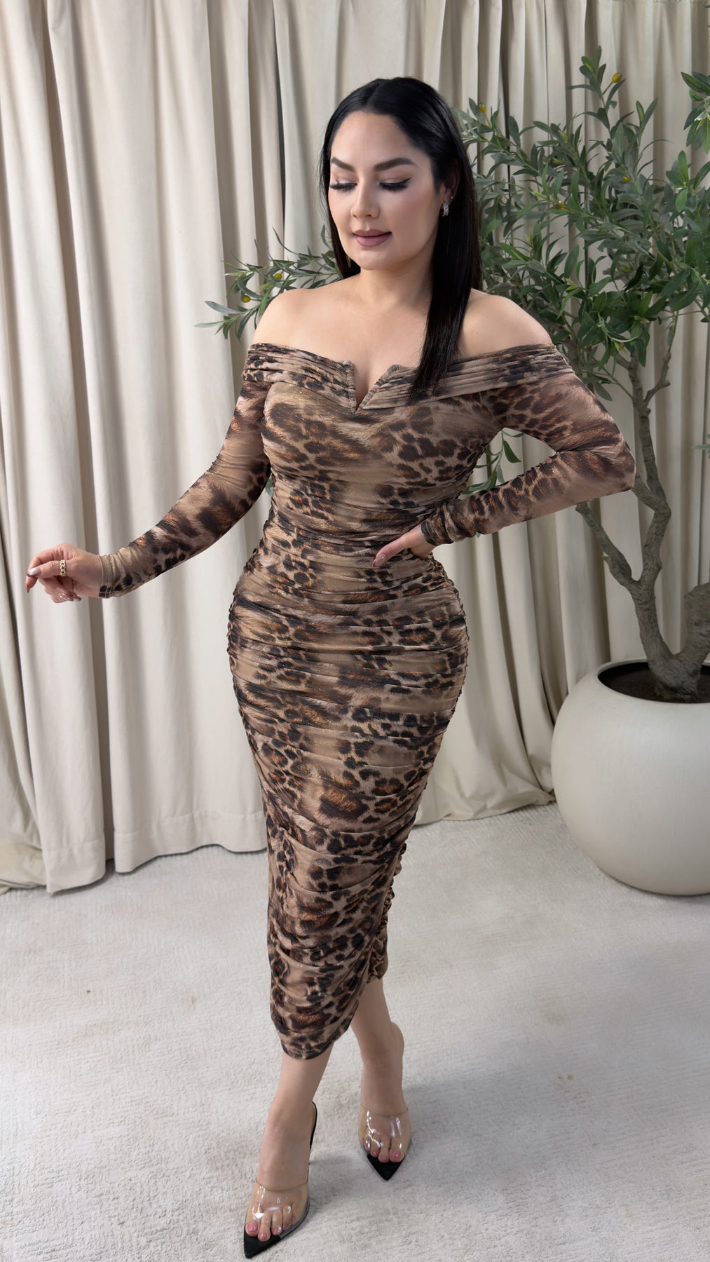 Off the shoulder long sleeve brown leopard print ruched midi dress Amazing fit.